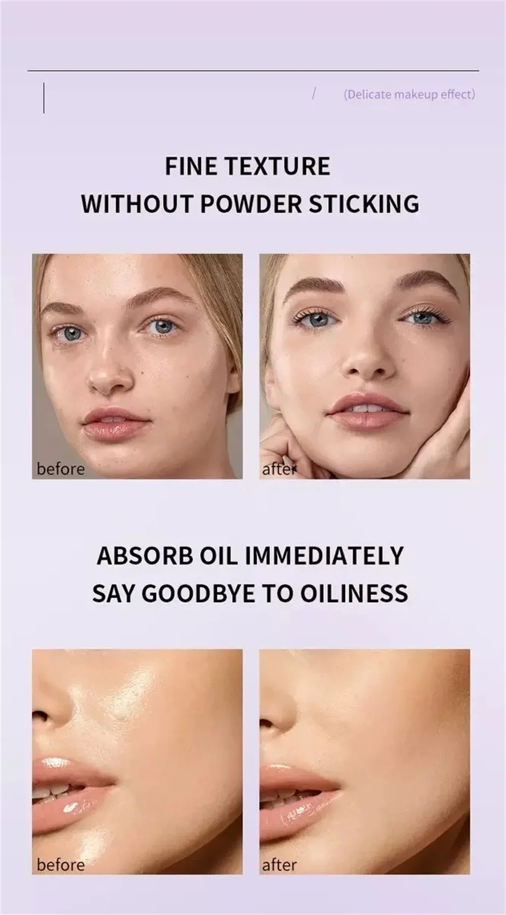 Longa duração e controle de óleo: Retém a maquiagem o dia todo, absorve o excesso de oleosidade instantaneamente.Mantém a pele fresca e com brilho - livre, garantindo que a maquiagem permaneça intacta de manhã à noite.